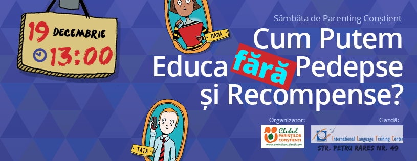 Ce: Întâlnirea din cadrul seriei de evenimente “Sâmbăta de parenting conștient” se va desfășura sub forma unui training dinamic în care vom discuta despre pedepse, recompense și cu ce putem să le înlocuim în relaționarea cu copiii noștri. Vom răspunde la întrebări concrete legate de modul în care putem să gestionăm relaționarea cu copiii, fără a ne poziționa în lupte de putere epuizante si vom descoperi modalități de creștere a copiilor bazate pe relaționare, comunicare și soluționare de probleme.